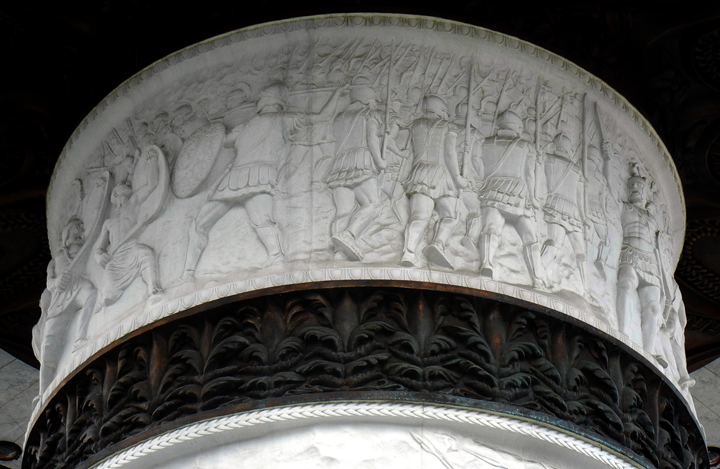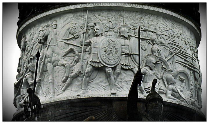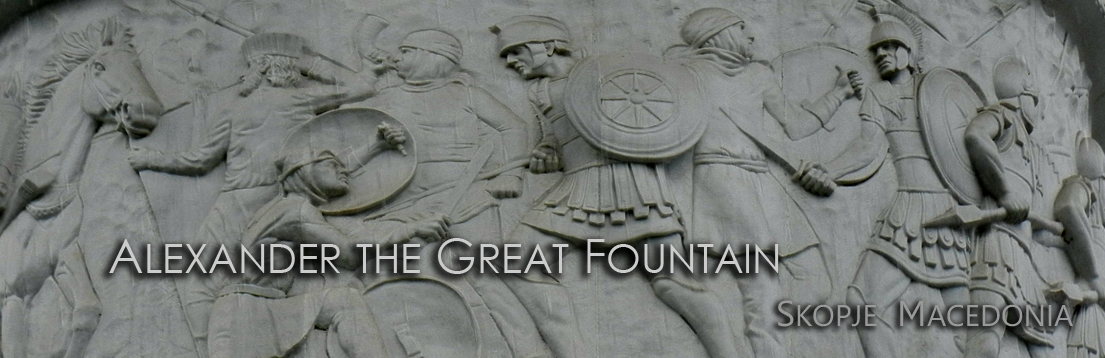 Marble Sculpture Reliefs of Alexander the Great Fountain The column pedestal under the Alexander the Great bronze statue consists of three large marble sculpture reliefs depicting the victorious battles of the Macedonians against the Greeks and Persians. Alexander the Great is shown on all three sculpture reliefs while his father Philip appears in the one showing the Battle of Chaeronea where the Macedonians defeated unified Greece. Each of the three marble sculpture reliefs is separated by bronze ring with ancient Macedonian motifs.